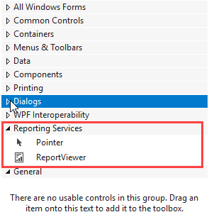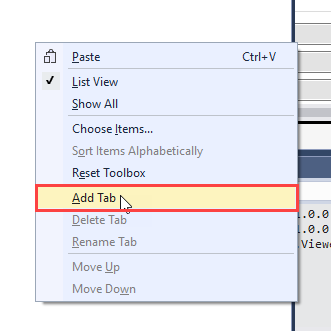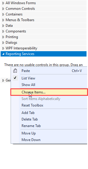 Now, right-click on the Toolbox in order to add a new tab and give it a name (Reporting Services).