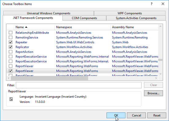 Now let’s add RDLC Report Viewer in the toolbox. As I am working on a Windows form application, I need report viewer control in the toolbox so that I can Drag and Drop it easily on the forms where I want to use it.