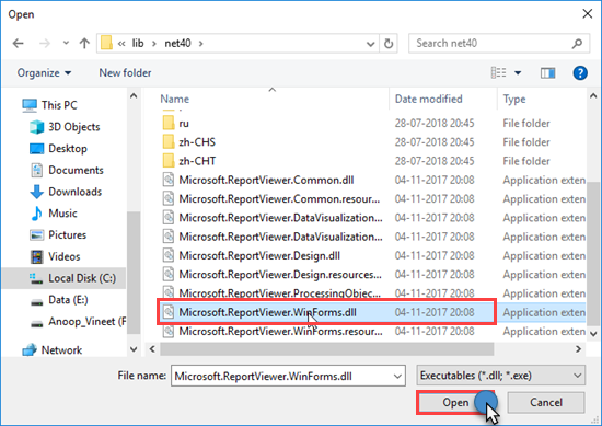 Go to the downloaded package's location and select the Reporting Views DLL. (As I ran Winforms command in NuGet package console for the Windows Form application, I have to select WinForm DLL).
