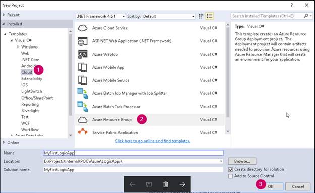Clicking OK will open Azure Template given below, where you can choose the built-in templates available with Visual Studio for quickly building Azure Services. For this example, select Logic app and click OK, as shown below.