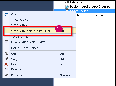 Restart Visual Studio and open the project. Again, right click on LogicApp.json file, as shown below.