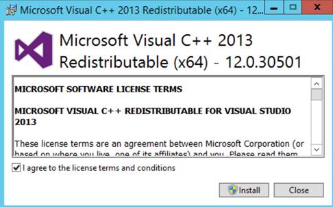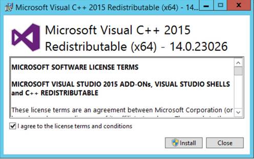 Now, we will install the Visual C++ Redistributed for Visual Studio 2015 and at this point, if Windows Server is not up to date, then this installation will fail. Make sure, at least KB2919355 is installed on Windows Server.