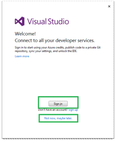 Visual Studio 2015 will open. We can sign in using Hotmail or Outlook mail Id. If you want to use it without signing in, just click “Not now, maybe later”.