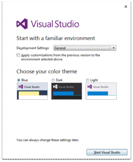 Now, the development settings are selected “General” by default. If needed, we can change that based on our requirement. Finally, chose color themes and click "Start Visual Studio".