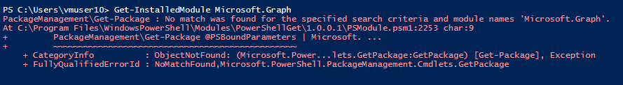 If the output has an error message that says "No Match was found for the specified search criteria and module names 'Microsoft. Graph'," this confirms that Graph PowerShell module is not installed on your machine.