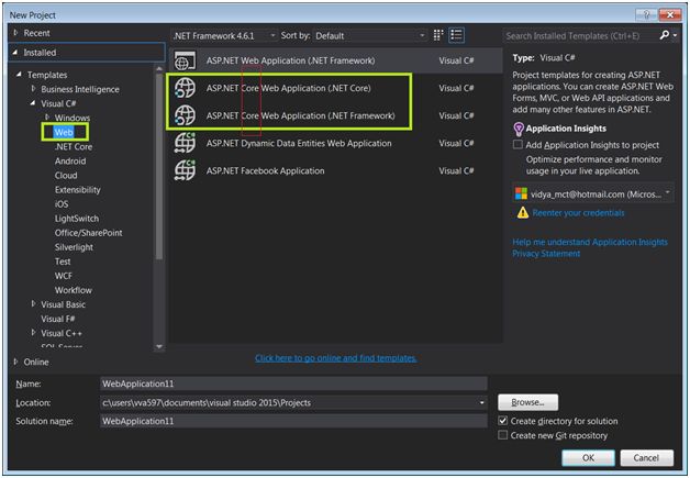 When you launch Visual Studio 2015, you will be looking for “.NET Core” templates, as shown in the image below: