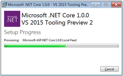 Once you have installed Update 3 and downloaded the DotNetCore.1.0.0-VS2015Tools.Preview2.Exe, just launch it and you will see the setup proceeds, going through the following steps: