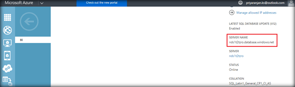 In the database Server name, specify the Server name of Azure SQL DB and the database name. The Server name can be obtained from Azure SQL DB Server dashboard.