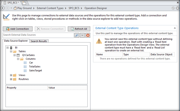 Select click here to discover external data sources and define operations link. Select Add connection from the resulting Window. Select the DataSource as SQL Server and click OK.
