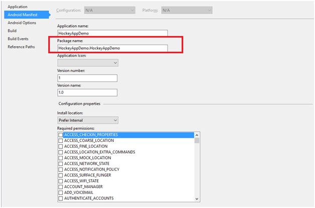 - Next step is we need to get the package name for our application. We will need this, when we register our application with Hockey app. To get the package name, right click on project and select Properties option. It will open up a window. To get the Package Name select the Android Manifest option in that window as shown below (F: 3).