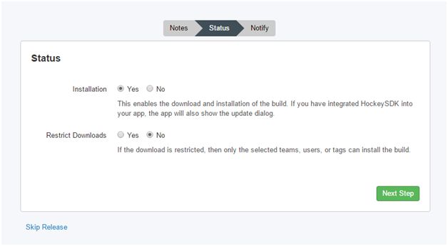 As shown in above image, installation option will allow our tester user to download and install the application through Hockey App Android Application. They will also get a notification when a new version of our application is released. Using the Restricted Download option, we can define which users can install this build of our application. Keep the default settings and click on Next Step button.