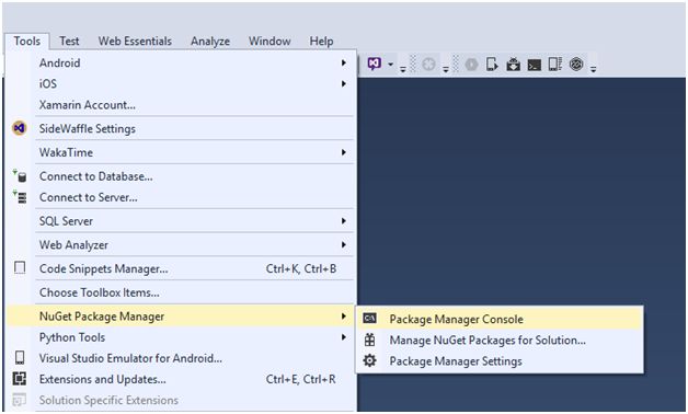- To install the package, go to Tools=> NuGet Package Manager=> Package Manager Console option as shown below (F: 2).