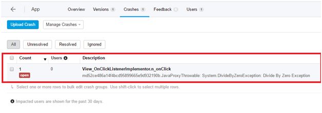 Click on Send Report button to send the crash details to Hockey app. Go back to Hockey app website and refresh the page. We will be able to see that our crash report is logged in Hockey app as shown below (F: 10)