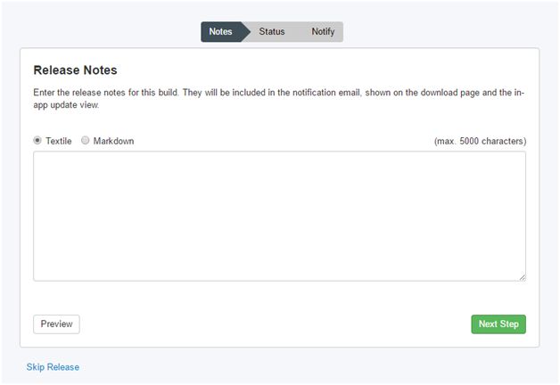 - After the upload is complete, we will get a new page as shown below (F: 18) where we can enter the release notes for our application.