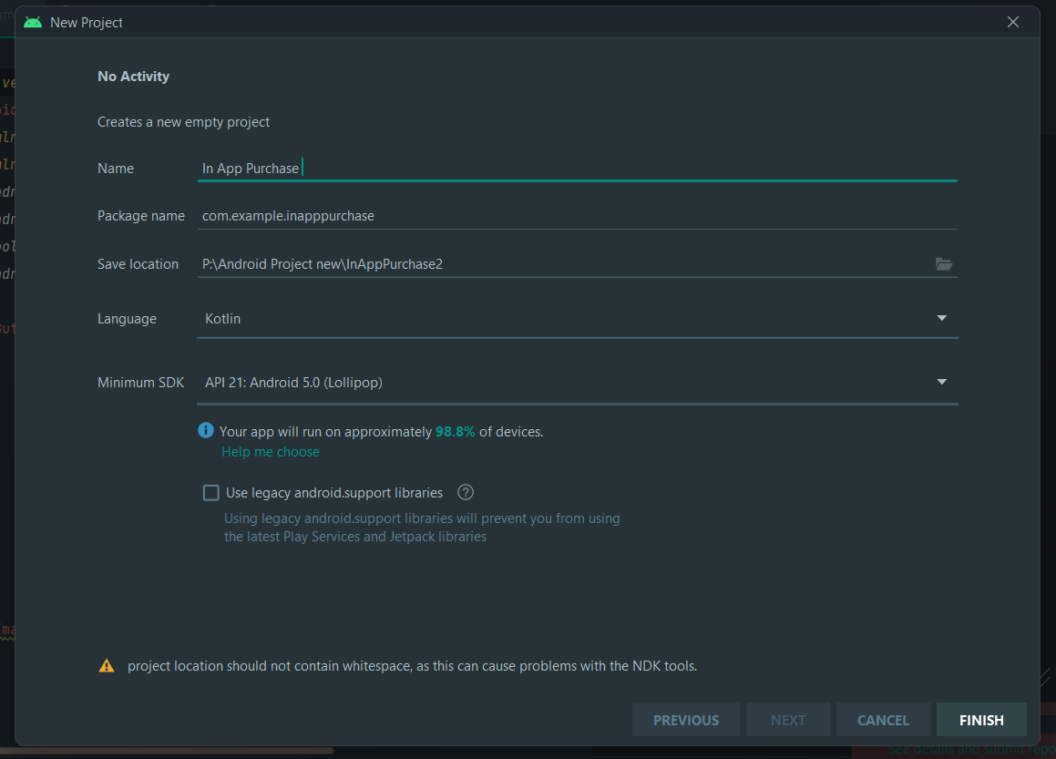 Create a new project in Android Studio with empty activity, Name your project and chose language as kotlin