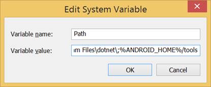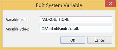- Open system properties, then add ANDROID_HOME environment variable and set its value with Android SDK path c:\\Android\android-sdk