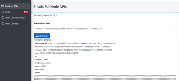 From the SmartContract API Controller, we will call endpoint API/SmartContracts/receipt which gives the receipt of the transaction. We have to pass transaction hash to get transaction receipt. It gives transaction receipts including Gas Used, From and To address, Logs, etc. Additionally, we will integrate endpoint /api/SmartContracts/local-call which creates a local call with a contract without a transaction. As we saw in the previous article when to use local call and contract call.