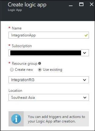 Since we will be working with a new Azure portal and all our resources will be created in ARM mode let’s create a Resource Group in Southeast Asia region before creating anything else. We will name our resource group as ‘IntegrationRG’ and logic app as ‘IntegrationApp’