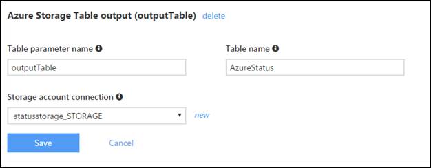 As we want this function to write entries in the Azure table storage, let’s select the output as table storage and select correct storage account i.e. ‘statusstorage’