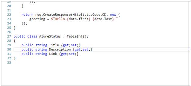 Next, let’s decide the schema of AzureStatus storage table. Process remains the same i.e. typically we define a class inheriting from TableEntity class so let’s add our AzureStatus class at bottom of editor