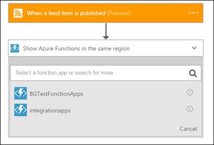 Let’s go back to the logic app editor and see if we can add this function as an action after RSS feed trigger.