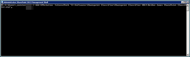 Add-SPSolution –LiteralPath “E:\software\Bolden James\Sharepoint Classifier\Sharepoint Classifier 2013\Boldon James SharePoint Classifier.wsp”.