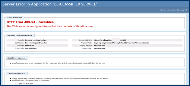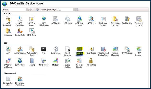 To fix the above error, navigate to IIS Manager and click on the “Bolden James classifier site “ that we created before. Open “Directory Browsing” module under IIS section.