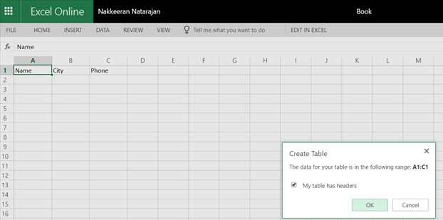 Excel sheet has been created. In this sample, an Excel sheet will have the addresses of the users/employees of the organization. Now, we need to create an app to enable the users to insert, view, modify, or delete the contacts from an Excel using the app. This helps an organization to track the data instantly on OneDrive.