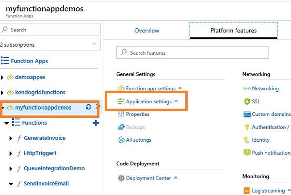 In SendGrid output form, provide the SendGrid API key which is stored in App setting available in platform features, as shown in the below figure.