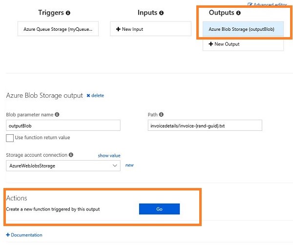 Select the Azure Blob output and click on "Go" to create a new function to send an email based on the Azure blob output trigger.