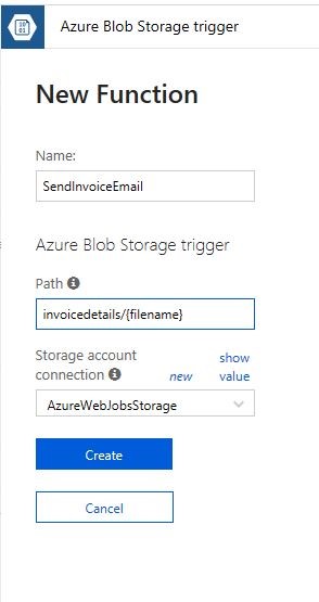 Now, we will get a form. Create a new function, name the function, provide blob path in path details. In my case, it is invoicedetails/{filename}. Now, give a storage account which we used in the previous function.