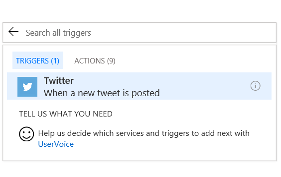 Now, trigger needs to be selected. For the data flow to happen, there should be a trigger, which should happen in Twitter.![]()