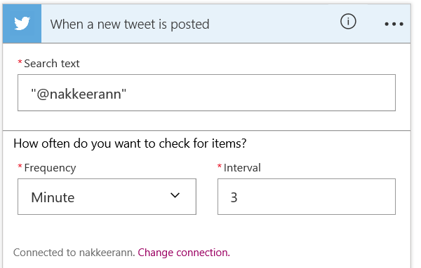 Here, if anyone on Twitter posts a tweet targeting Twitter handle @nakkeerann, the same will be saved to SharePoint list. In the search text box, provide the search keyword “@nakkeerann” and set the time interval in minutes.