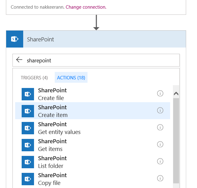 Now, action needs to be configured. In the new step, search and select SharePoint. Under actions, select Create item option. Login to the required portal, using the admin/default Office 365 credentials.