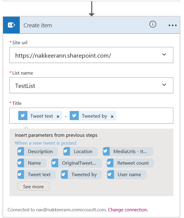 In the create item configuration screen, select the SharePoint site URL, list name and the title to be posted. Here, the title contains tweet text, posted by user Twitter handle Id.