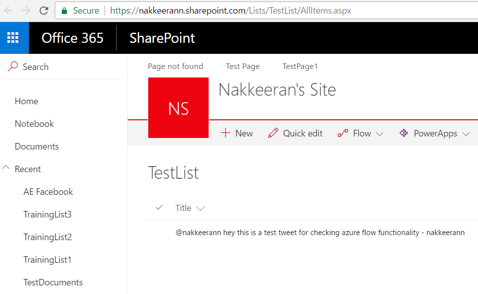 Wait until Logic app runs or you can login to Azure to run Logic app. Now, login to SharePoint portal and navigate to the list to find the tweeted text.