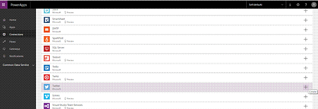 Navigate to here. Select connections on the left pane. Find and select “Twitter” and click on create icon.