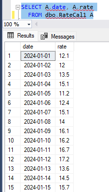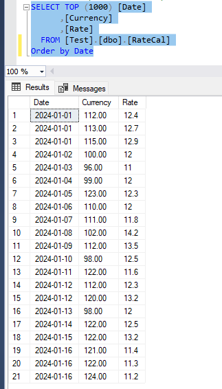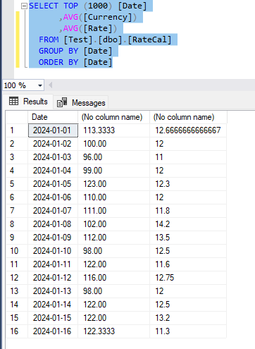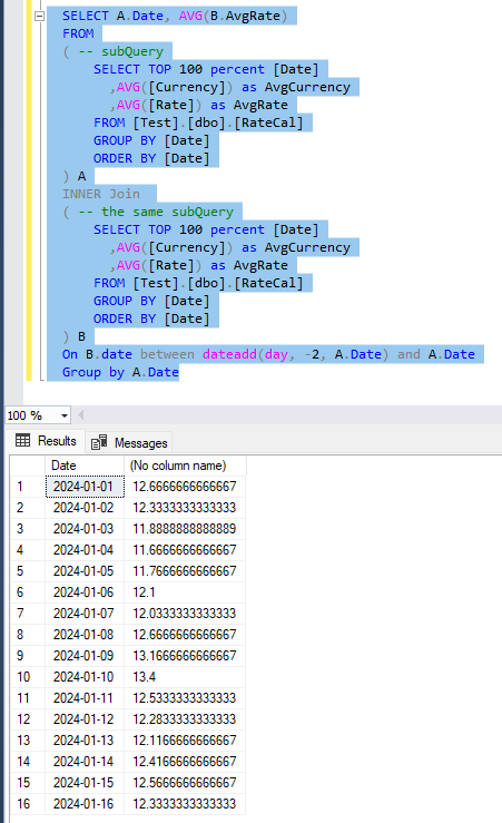 For the given question, we have made the daily average, then the rolling average will be against the new created daily average that could be a subquery. To make the analysis simple, we make another data table, to simulate the rolling everage logic first and independently. To do this, make a simple table: RateCal1 as