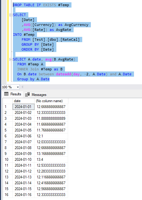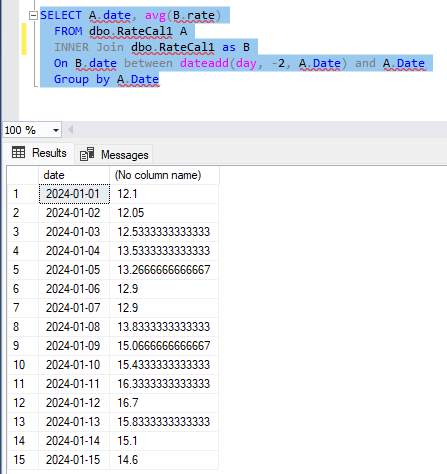 Examine the code, we made a self join for the Table RateCal1, For each row in our table, we join every row that was within the past 3 days and take the average.