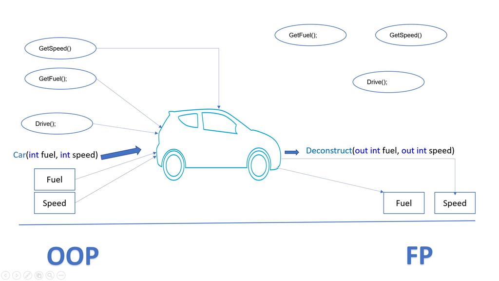 As shown, in the image above, it becomes easy to perform the Car operations on the deconstructed data structures, and you can add the new operations(methods) easily. The core concept is, when you have a stable and a known data structure, it’s often very interesting to apply the pattern matching approach because you can quickly expand the operations. However, if your operations are stable, but the data changes, then the OOP approach seems more adequate.