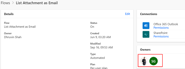 We have one Power Automate flow which is shared with Dhruvin and Shriraj.