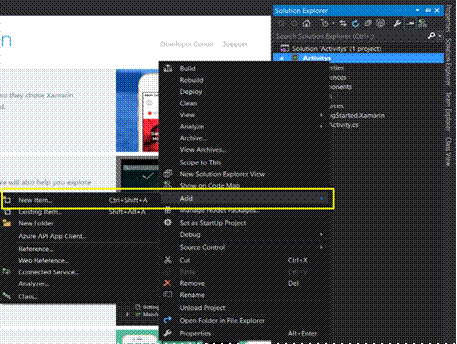 When we create a project, using wizard, the project content's main activity in "Resource/Main.axml" is layout of Main Activity and also it has MainActivity.cs. For adding new layout and activity, right click on project in Solution Explorer, select Add->New Item. New Window will open, first add new “Android Layout” and then add new “Activity”.