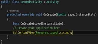 First, we need to define layouts for each activity. To do this, we need to call SetContentView method in OnCreate() method of each activity. The OnCreate() method in MainActivity.cs and SecondActivity.cs looks, as shown below.