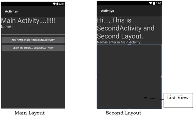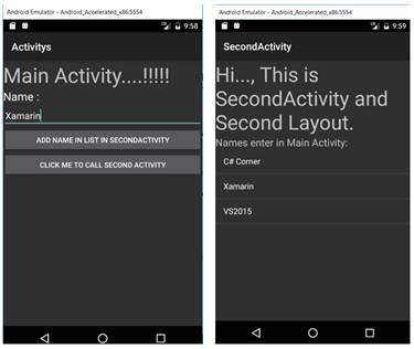 To show how to pass the data from an activity to another activity, I have to add one EditText box (for entering name of person) and one more Button “Add Name in List in Second Activity” to Main Layout(Main.axml). Modified Main Layout is shown below. Similarly, I have added one ListView in Second Layout (second.axml) to display the names supplied from the main activity.