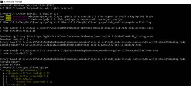 Angular CLI(Command Line Interface) is a command line interface to scaffold and build Angular apps, using Node.js style modules. Not only does it provide you with a scalable project structure, it handles all common tedious tasks for you out of the box. Write “npm install –g angular-cli” in your command prompt Window and press enter. It will take little time and then install the required files for Angular CLI.