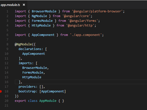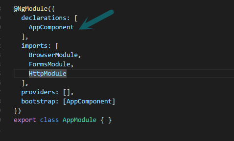 On the top of the page, you can see “import { BrowserModule } from '@angular/platform-browser';” code of line. These lines describe the modules, which we import into our root module and also define the path, where these modules exists. In the code given above, we extract the BrowserModule, NgModule, FormsModule, HttpModule, AppComponent. You can find all of the module sin “node_modules/@angular” folder.