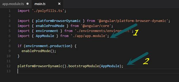 After completion of DOM reading by the Browser, first the Main.ts file is loaded. In main.ts file, first we export the “app.module” file by the class name (AppModule), which we define in app.module and in the next step, call the bootstrapModule() function and pass the name of AppModule, and bootstrap the AppModule.