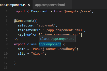 Metadata defines the way to process a class. We can define the metadata by using decorator. Let’s see our component class. In this class, you can see that we used the “@Component”, which is metadata that defines this class has a component. This metadata is attached with TypeScript by the decorator. If the “Component” is not defined, then TypeScript treats this as a simple class.