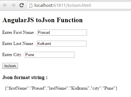 Enter the text in textboxes firstName, lastName and city, and click on ‘toJson’ button; you can see the result is in JSON formatted string as follows: