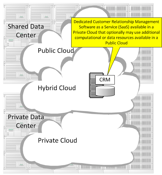The following figure is one example of a Hybrid Cloud. It uses Customer Relationship Management (CRM) Software as a Service (SaaS) to illustrate a Hybrid Cloud.